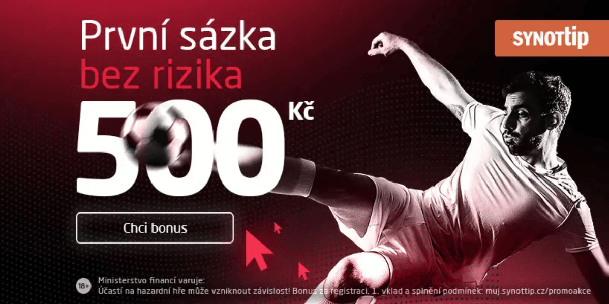 Ano, SYNOT TIP nabízí bonus 500,- pouze za dokončení plné registrace a ověření účtu. Není nutné vkládat vlastní peníze.