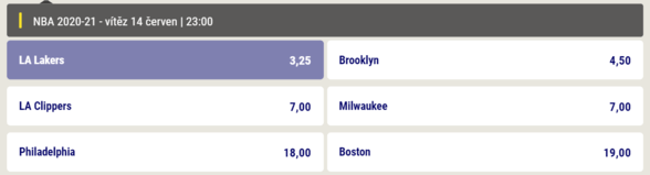 Právě obhájce trofeje považuje sázková kancelář Sazkabet prostřednictvím svých kurzů za největší favority na celkové vítězství, s čímž se dá úspěšně souhlasit. Na tom se ostatně shodují i renomované zahraniční portály a řada odborníků skutečně pasuje Lakers do role vůbec největšího favorita. Kurz 3,25 je v tomto případě velice slušnou pobídkou.